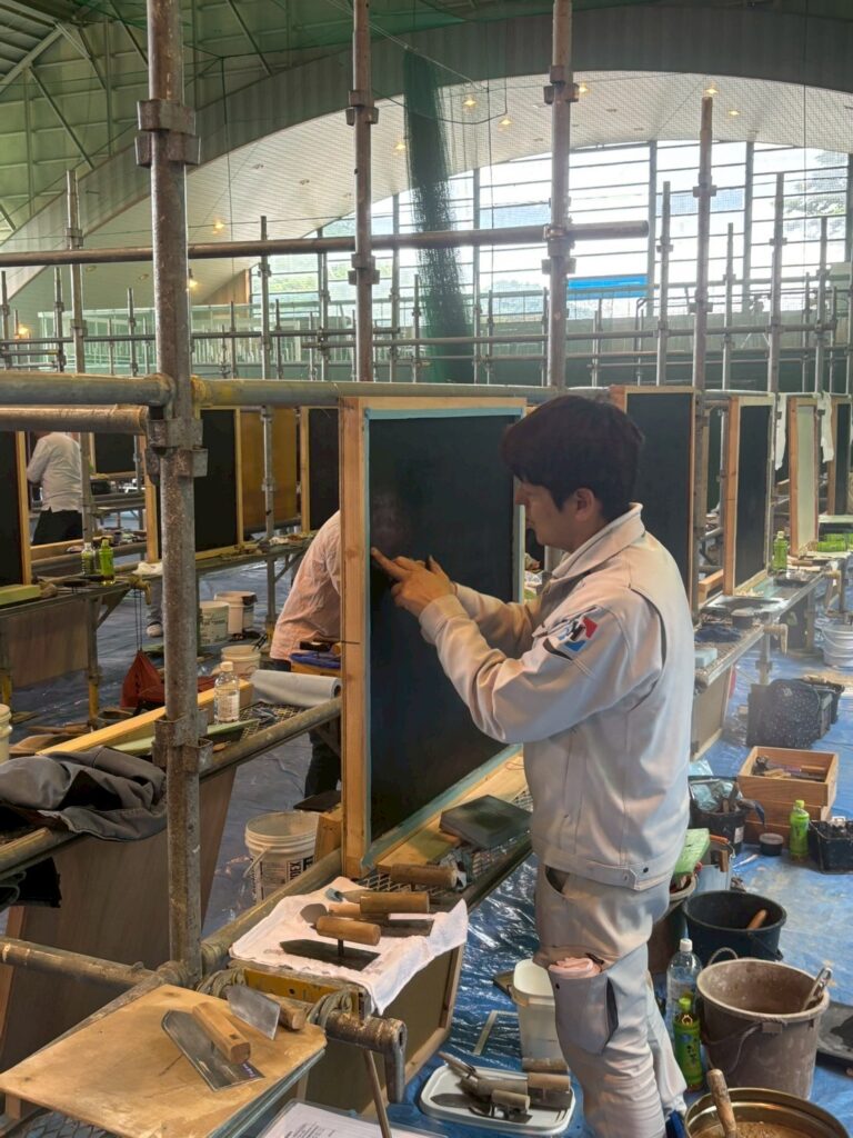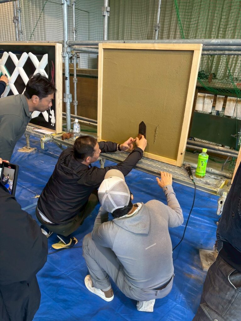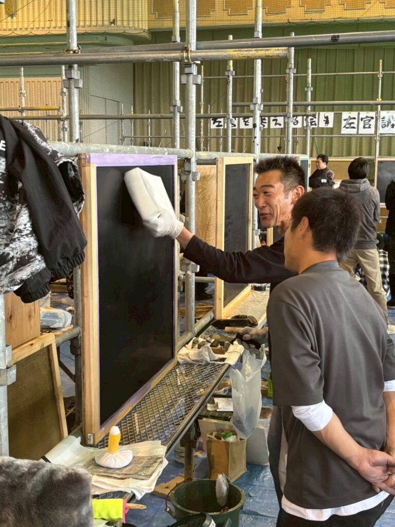 さらに、高度な平滑さと光沢が求められる「漆喰黒磨き」の講習も行われました。張り詰めた空気の中、受講生が自身の鏝(こて)さばきと向き合う姿が印象的でした。